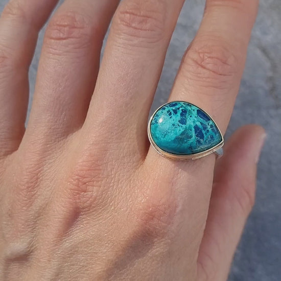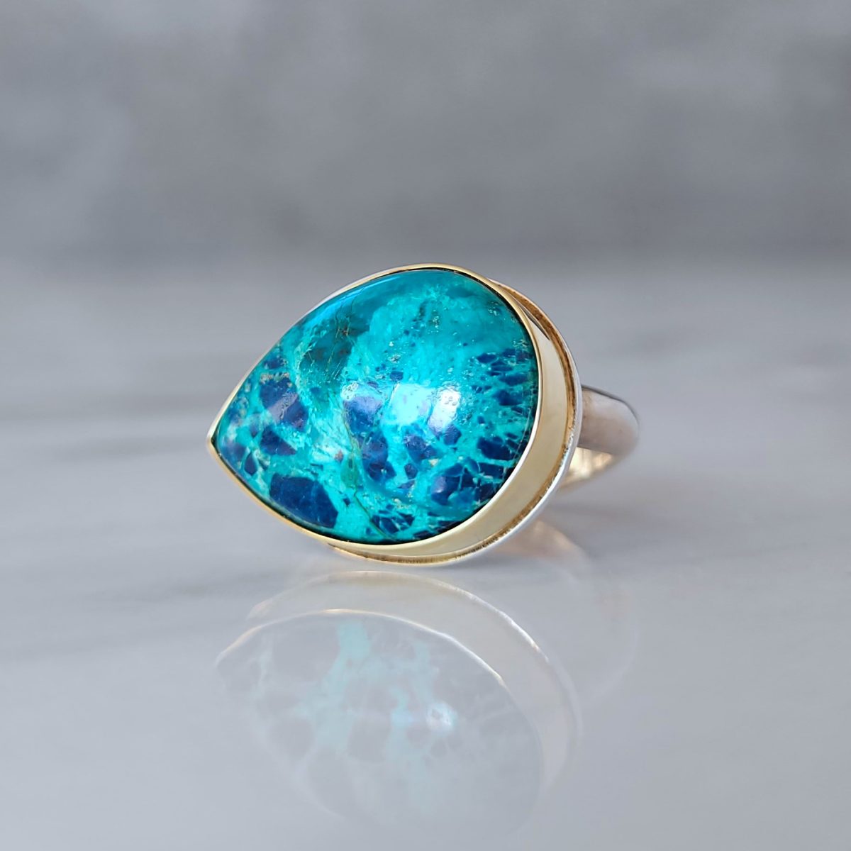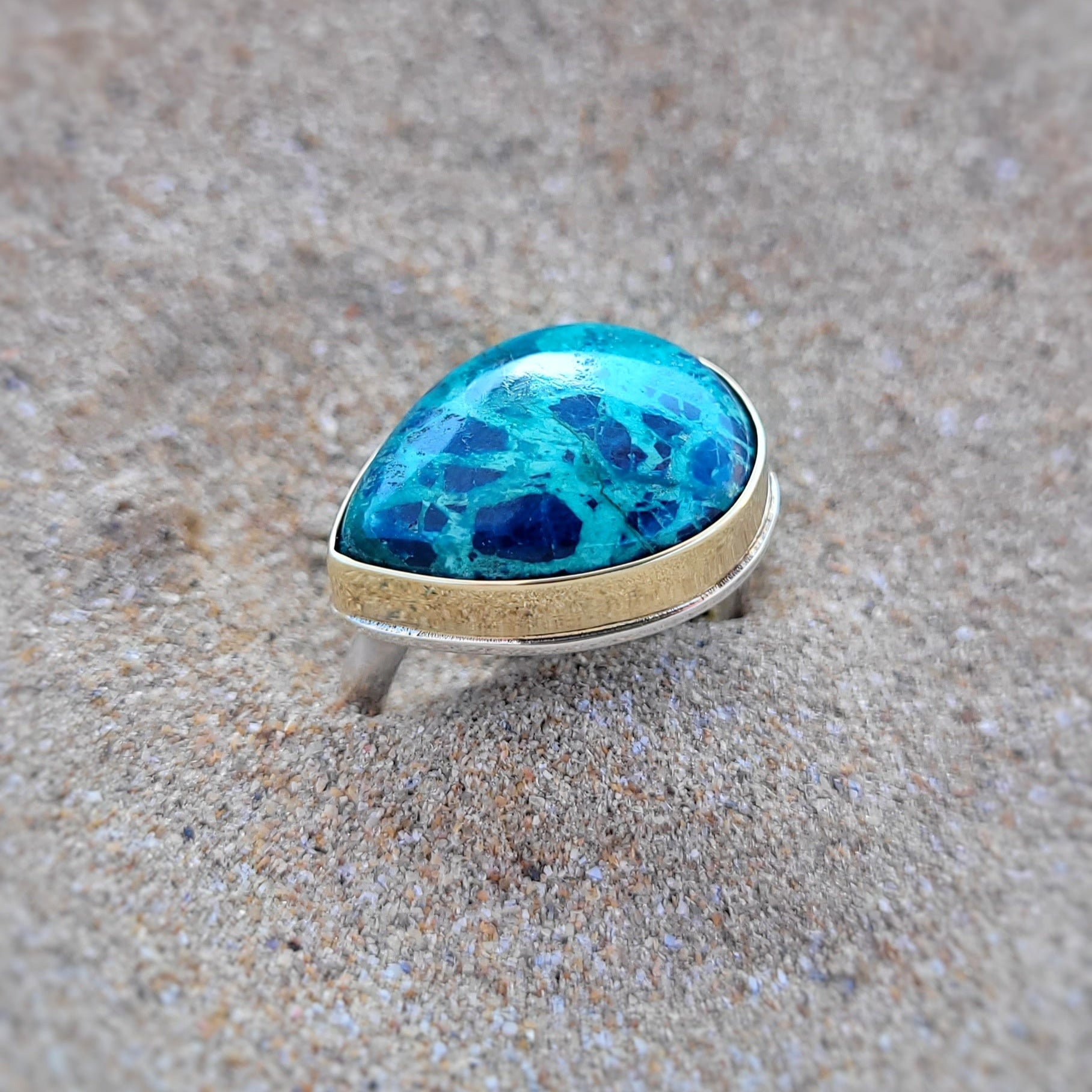 Chrysocolle sertie en or jaune 585 millième et montée sur un anneau en argent 925 millième.