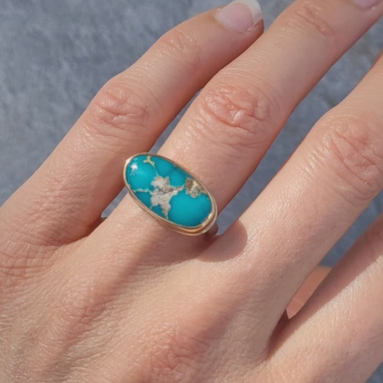 Turquoise de Perse sertie en or jaune 750 millième et montée sur un anneau en argent 925 millième.