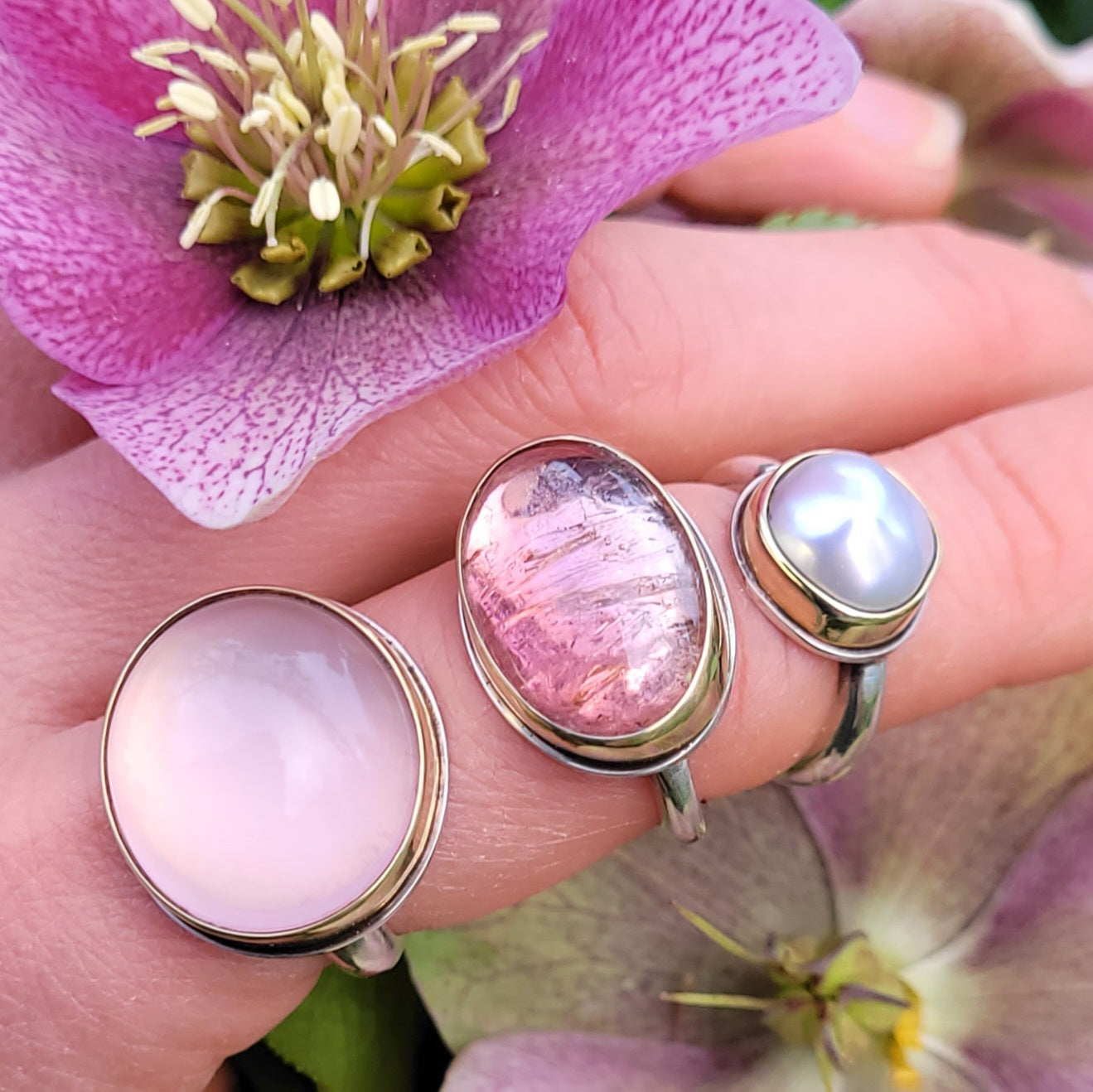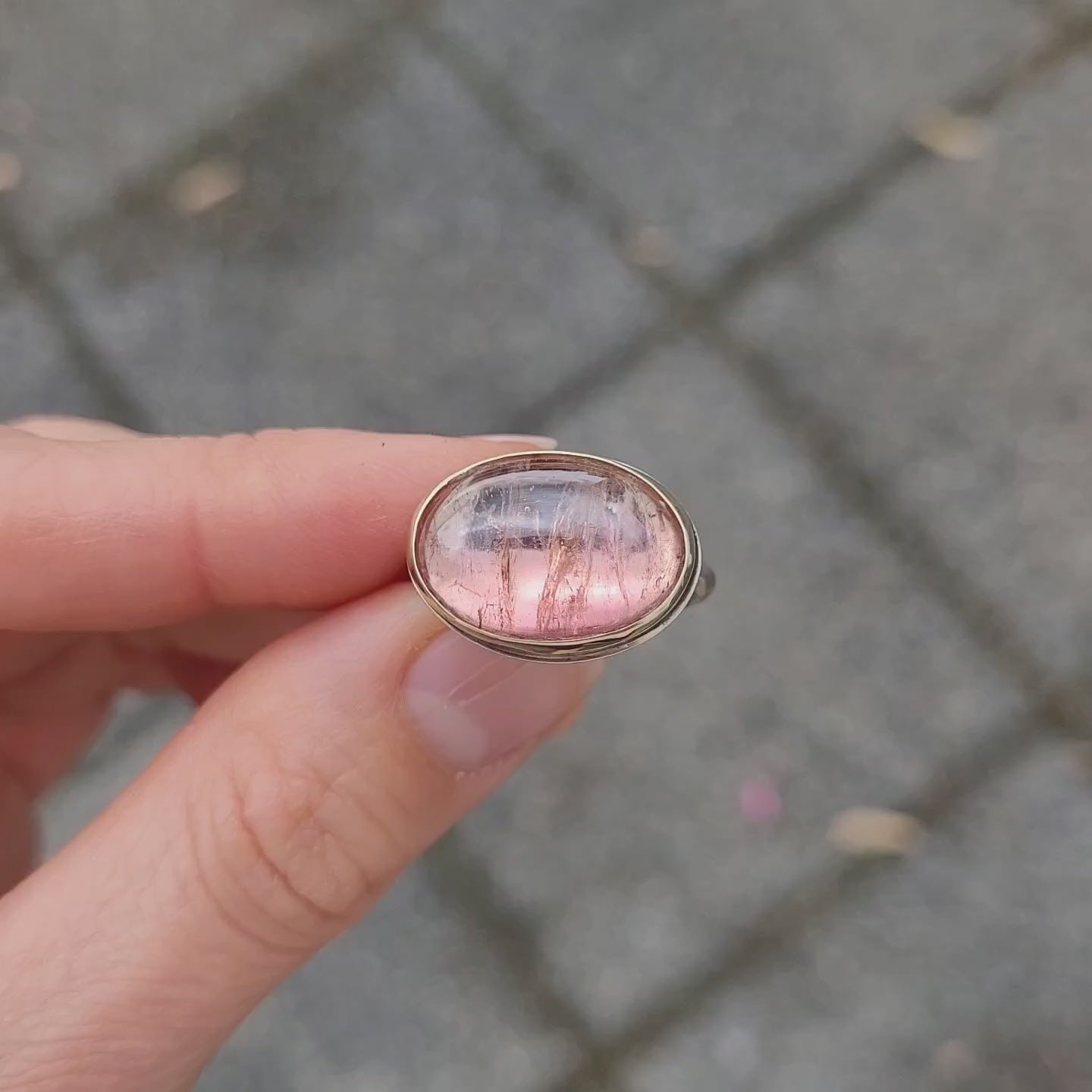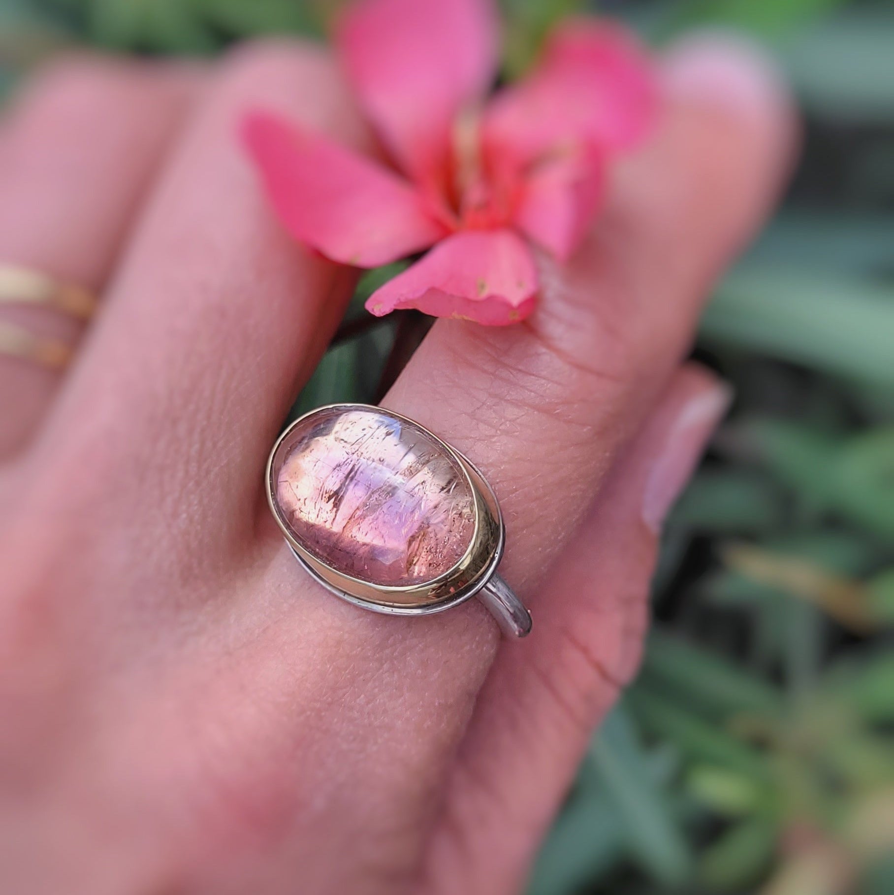 Tourmaline rose bicolore sertie en or jaune 585 millième et montée sur un anneau en argent 925 millième