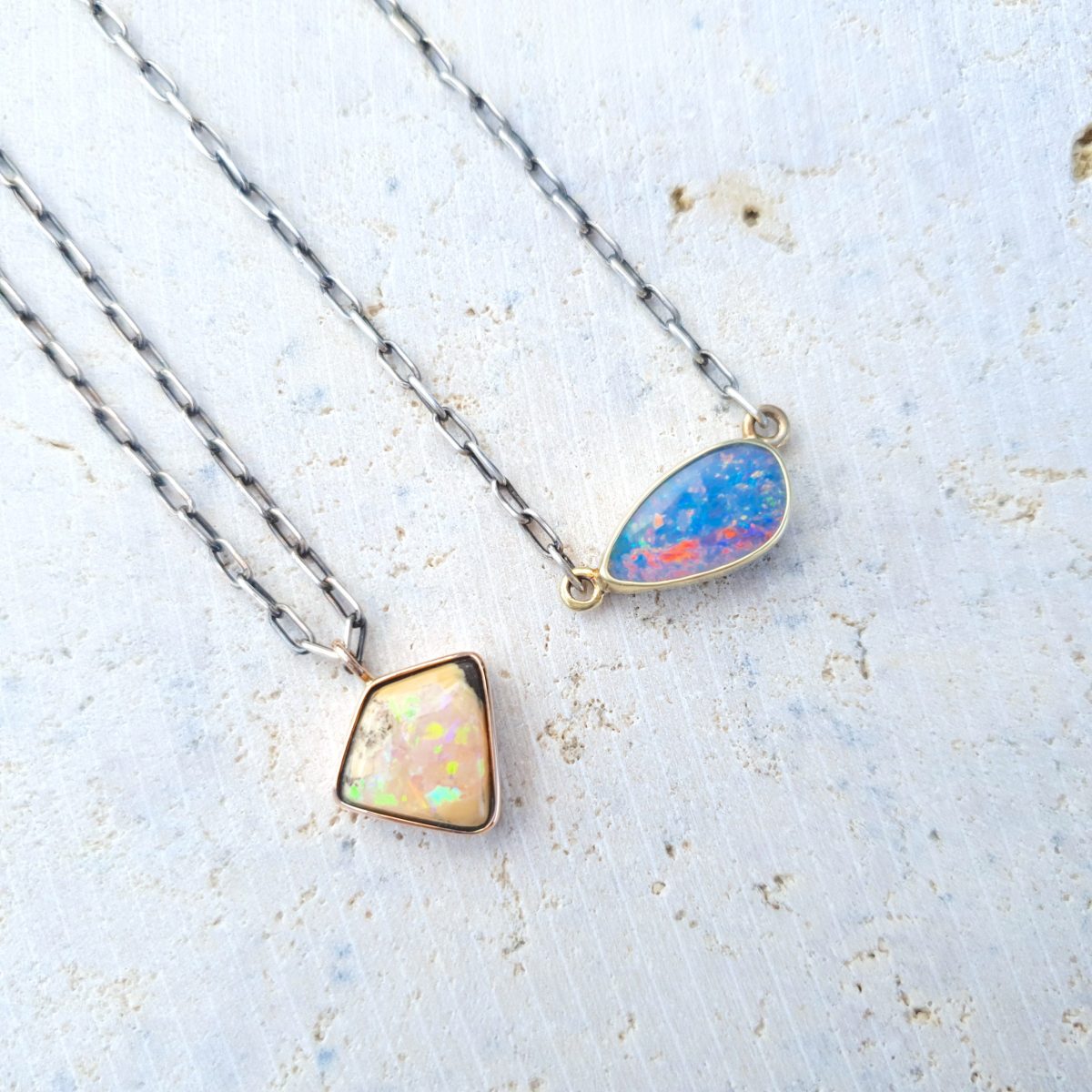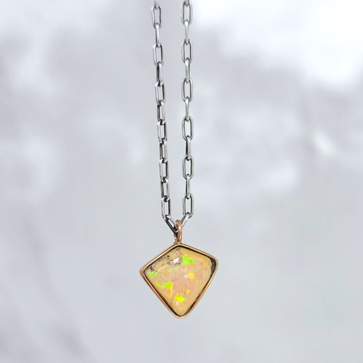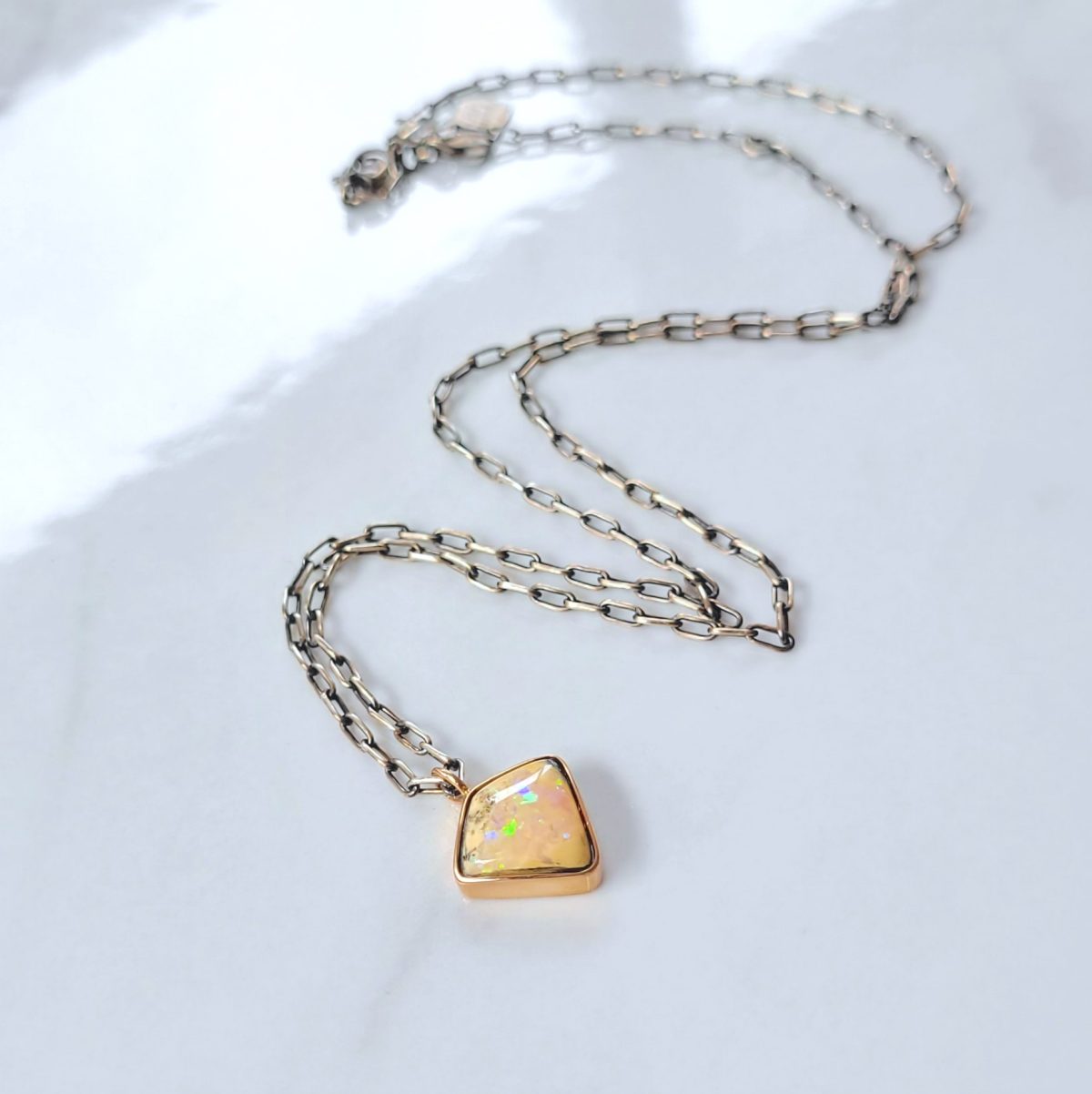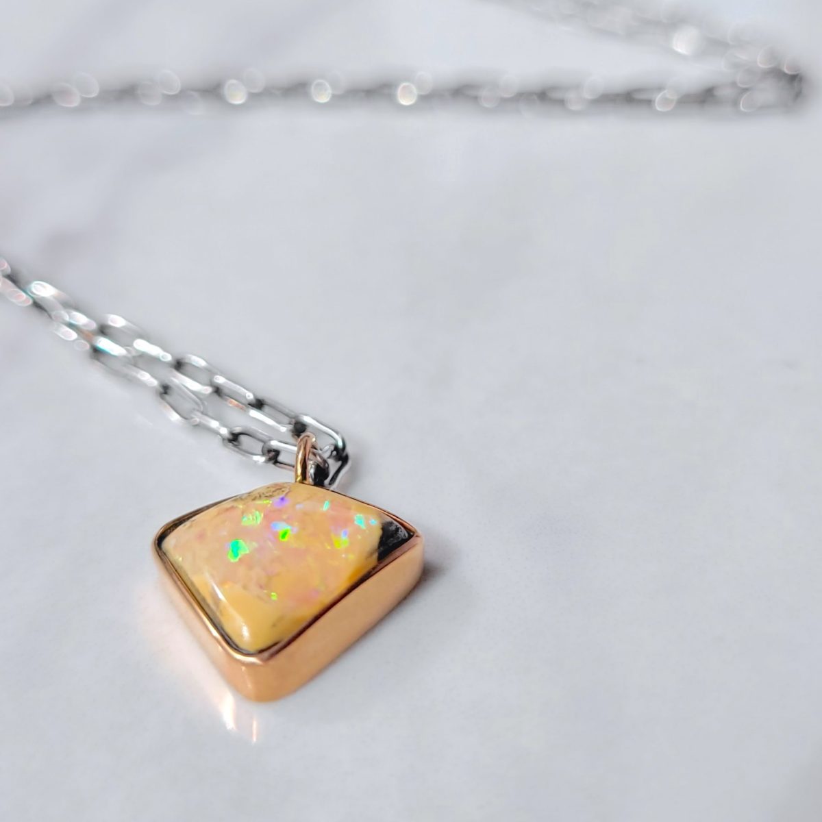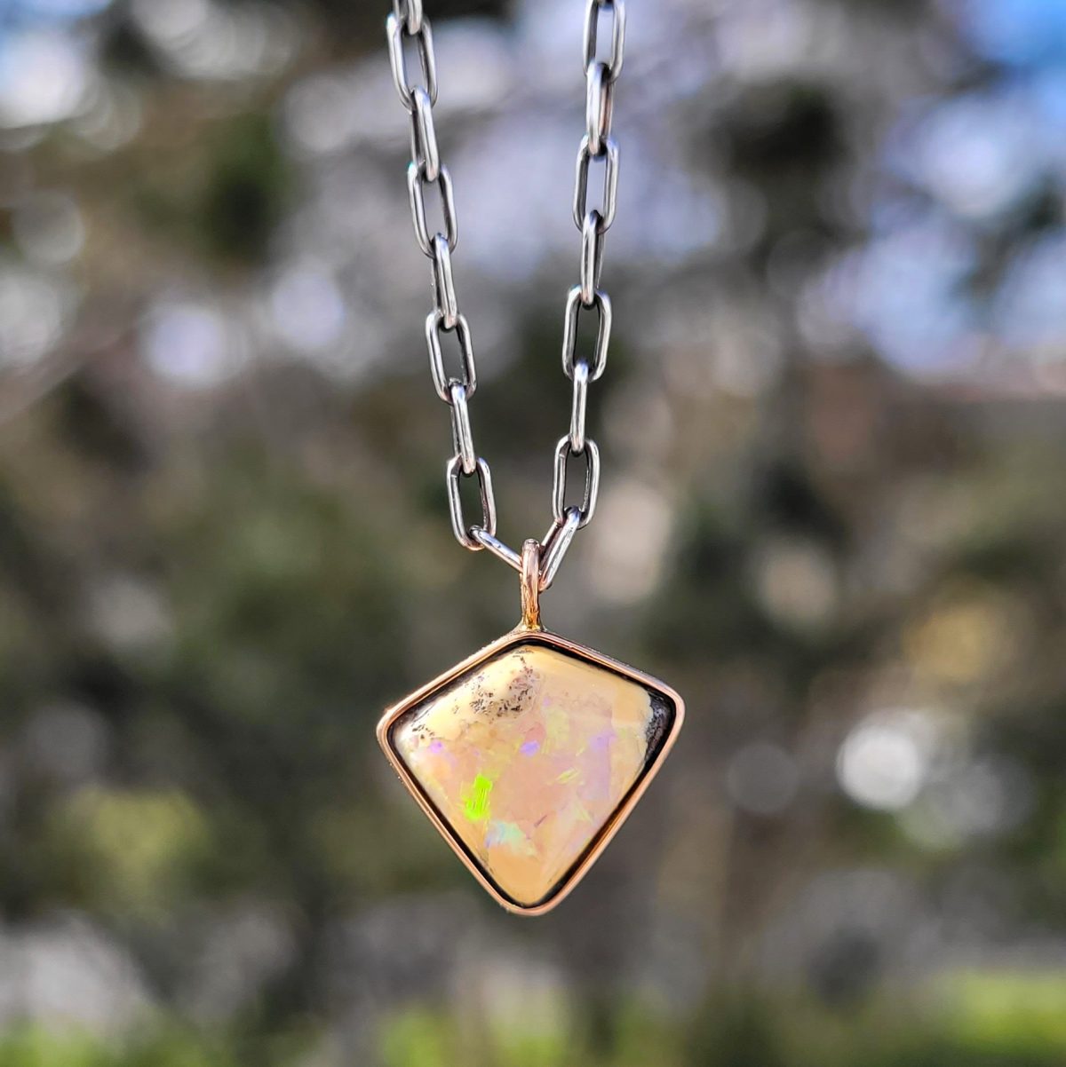 Opale Boulder d’Australie au motif Pinfire, sertie en or rose 750 millième et montée sur une chaîne en argent 925 millième oxydée.