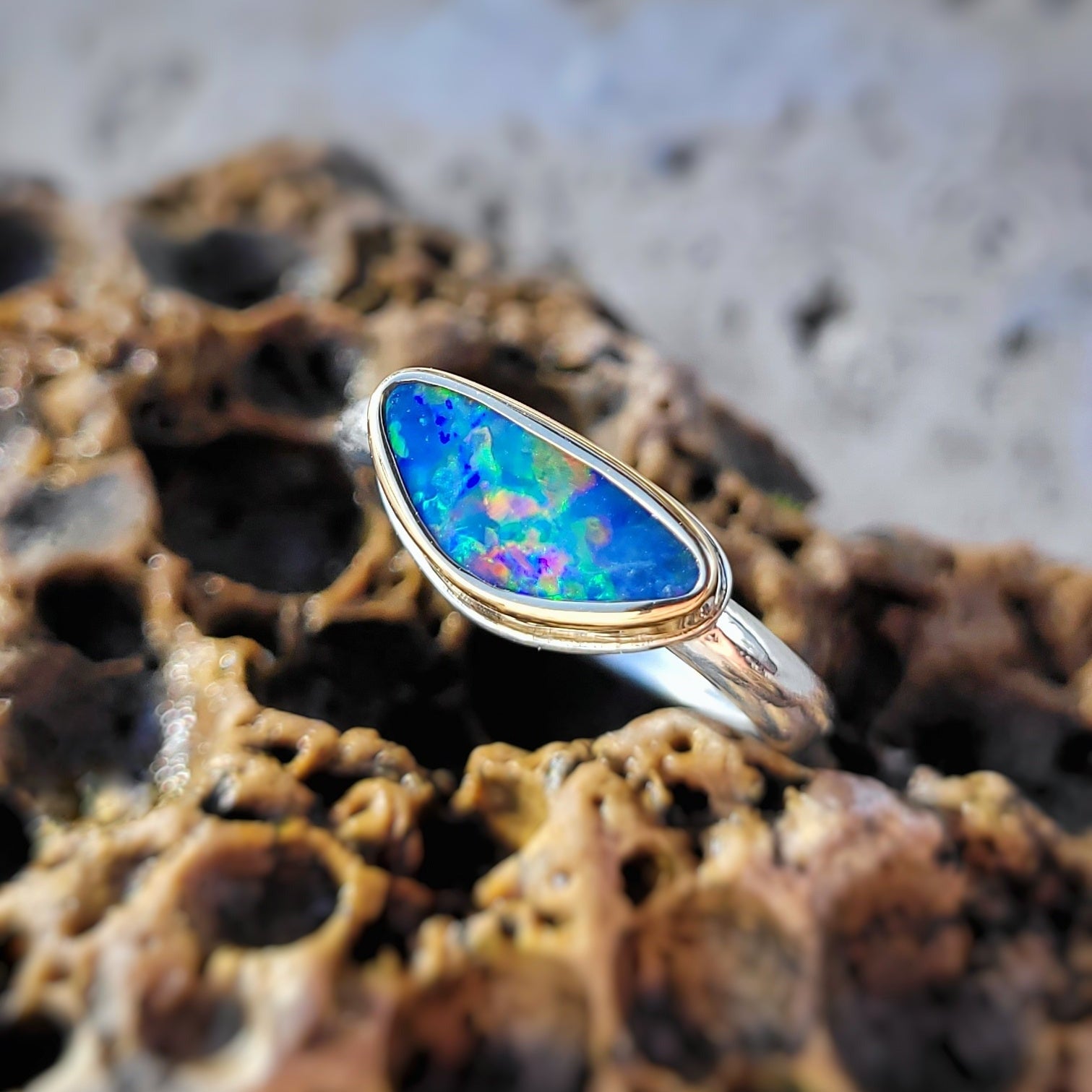 Une pimpante petite opale d'Australie aux feus vifs et multicolores. Sa forme originale et délicate en fait une pièce unique à porter seule ou en accumulation. Sertie en or jaune 750 millièmes et montée sur un anneau de forme organique en argent 925 millièmes.
