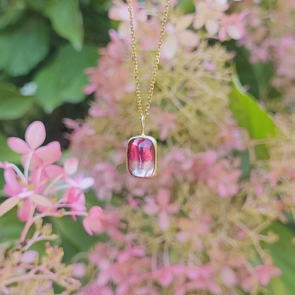Tourmaline rose bi-colore "Vanille Fraise" sertie en or jaune750 millième et Argent 925. Chaîne en or jaune 750 milième.