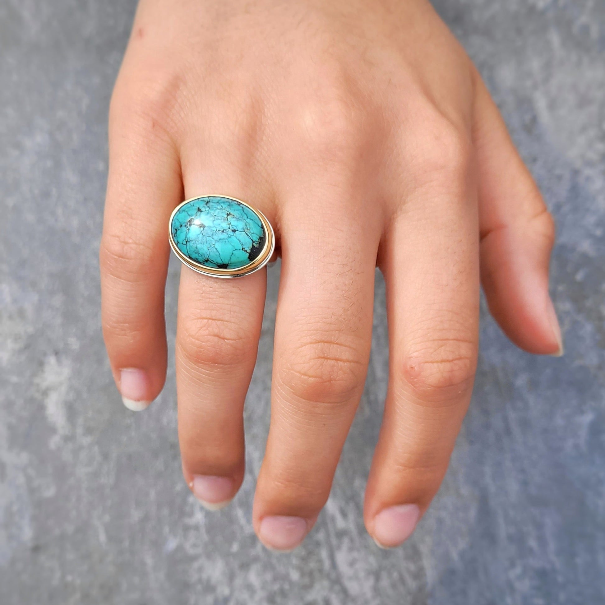 Turquoise des Etats Unis sertie en or jaune 750 millième et montée sur un anneau en argent 925 millième.